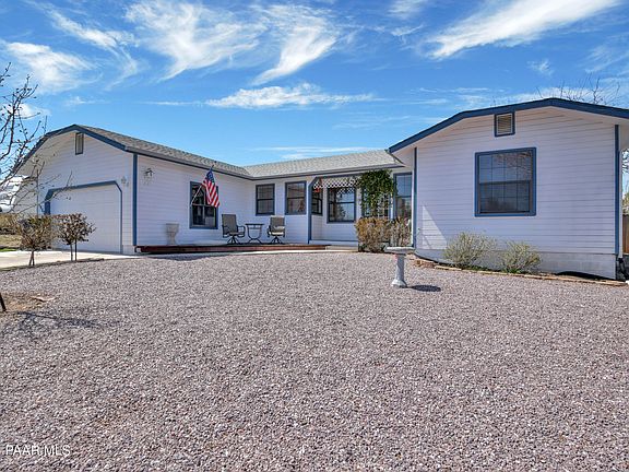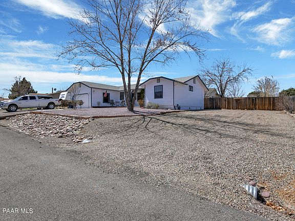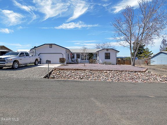 Fantastic home in Prescott Valley! 3 bedrooms, 2 bathrooms, 2 car garage, 1,454 square feet. Carpet, tile, and laminate flooring. Spacious family room with vaulted ceiling and a cozy wood burning fireplace. Great kitchen with a breakfast bar. Large master bedroom with a gorgeous master bathroom with walk in shower and dual vanities. Laundry room. Enclosed sunroom leads to fenced backyard with jacuzzi and storage sheds. Nice deck in the front yard for morning coffee. See list of property features/upgrades and negotiable items in documents tab. The bar in the sunroom is negotiable if the buyer might want it but is not included in the conveyances. Same for the vanity in bedroom, wall hung mirrors, oak chairs for the breakfast counter and birdbath in the front yard. Come take a look today!