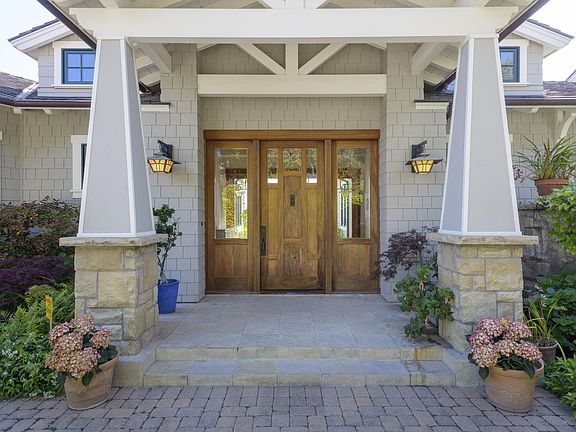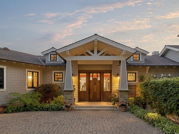 Perched on a Park Highlands promontory with 180° ocean, island, and mountain views, this modern Craftsman-inspired retreat offers luxurious living and year-round sunsets. Enjoy Santa Barbara's iconic pink mountain moments from expansive view decks, an infinity pool, and lush, fruit-filled gardens. Inside, rich Arts & Crafts details include natural wood, stonework, built-ins, and a spacious kitchen opening to a great room with fireplace and bar. Views surround the formal living, dining and family rooms which are framed by classic Craftsman pillars and rich wood detail. The primary suite is a serene escape with spa bath, fireplace, and private balcony. All bedrooms feature ensuite baths and walk-in closets. A separate-entry suite adds flexible space for guests, gym, or office.