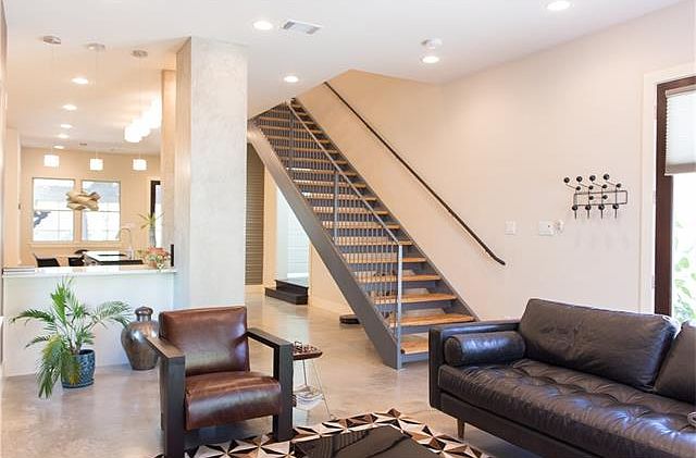 This modern/contemporary home in HYDE PARK offers a beautiful, open floor plan with kitchen island, marble/silestone countertops open to family room, stained concrete, hardwood floors, open air staircase, gas fireplace, and a fenced yard with custom, creative landscaping! Also offers a unique patio plan great for entertaining. This trendy home is in the heart of Hyde Park with a 10 min drive to downtown Austin!