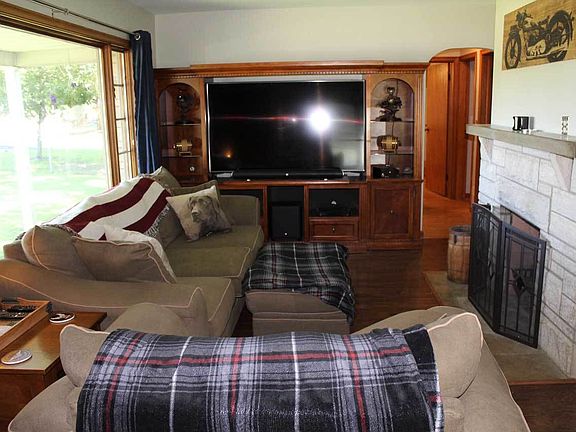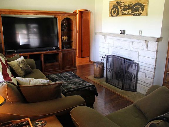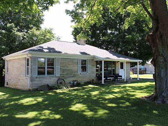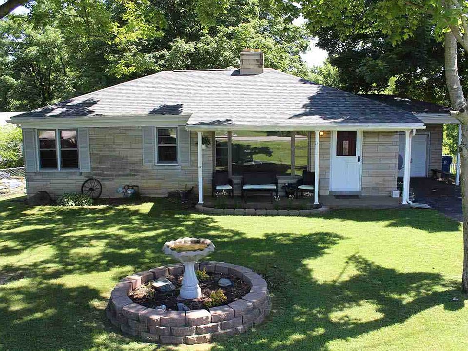 West side gem on a full acre lot! Lovely 3 bedroom, 1.5 bath stone home with adorable covered front porch and a walk-out basement. Hardwood floors throughout the main level. Large living room with fireplace, built-in corner cabinet, and big picture window overlooking the landscaped front yard. The kitchen has an island with built-in range/oven, lots of cabinet and counter space, vinyl flooring, and is open to the dining room. There are also 2 generous bedrooms and a full bath on the main level. The walk-out lower level has a bedroom with half bath as well as an unfinished area that houses the laundry area, storage space, furnace & water heater. The back patio has an enticing view of the deep lot lined by mature trees. There is an attached 1 car garage, extra parking pad, and a driveway that circles around to the back of the house for even more parking.