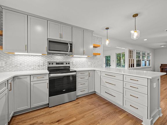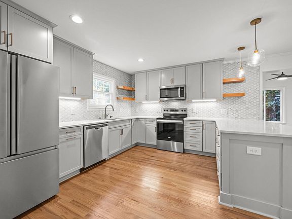 ***Now offered at a new, more attractive price! *** Step into timeless elegance at this beautifully updated Raleigh home, where every detail has been carefully curated for both style and comfort. The heart of the home is the chef's kitchen, featuring slow-close cabinetry, gleaming quartz countertops, a designer tile backsplash, undercabinet lighting, recessed lighting, and rich hardwood floors that flow seamlessly throughout. Outfitted with stainless steel appliances and offering a tremendous amount of storage with floor-to-ceiling built-in cabinetry, this kitchen is both striking and highly functional. The open floor plan is anchored by a cozy gas fireplace, creating a warm atmosphere perfect for both everyday living and entertaining. Additional highlights include a sun-filled sunroom, a formal dining room, and three fully updated bathrooms that pair beautifully with the home's four spacious bedrooms. Practicality meets charm in the expansive laundry/mud room conveniently located off the carport. Storage is abundant with two closets in the carport plus a large 11' x 19' storage building. Outdoors, enjoy a private fenced-in backyard with mature trees and plenty of room for relaxation or play. Perfectly situated, this home is just a short drive to downtown Raleigh, RTP, and offers easy access to interstate 40/ 440 and the new 540 extension. The charming neighborhood is home to Greenbrier public park featuring a tennis court, a playground, picnic shelter, and even a fishing pond, ideal for weekends close to home. With its blend of modern updates, elegant finishes, and unbeatable location, this home is a rare find in one of Raleigh's most desirable communities.