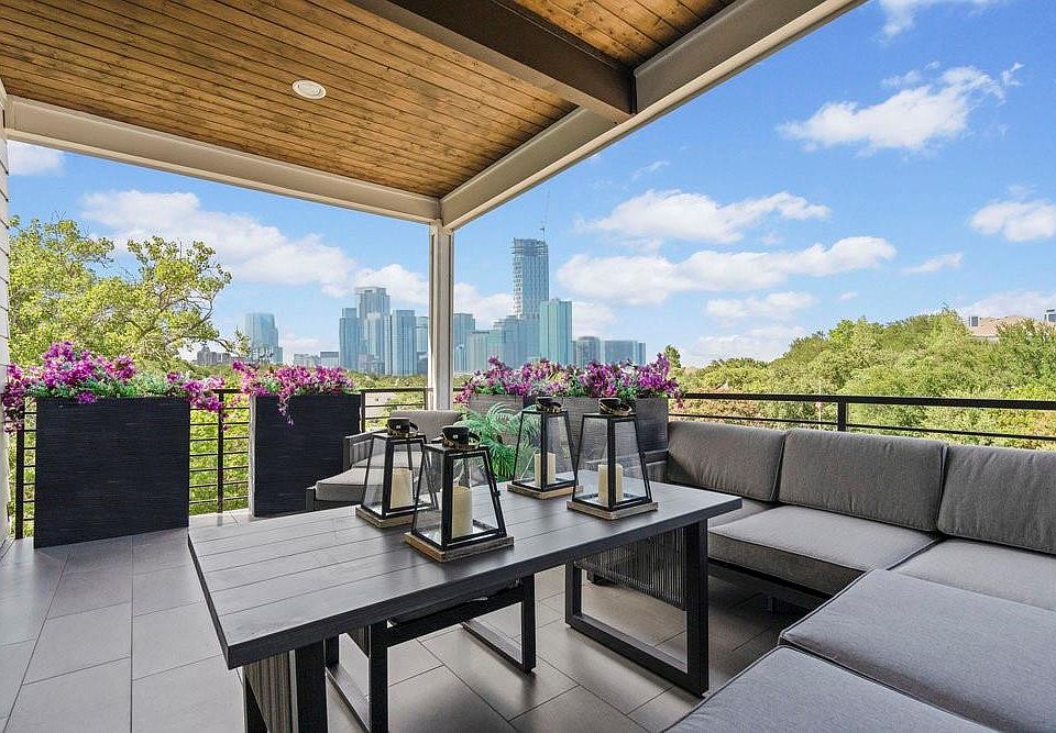 10 out of 10! Three story detached modern townhome that lives like a single family home, large yard, 2 decks, picturesque view of downtown, backs to greenbelt, high end finishes w/a soothing color palette. Light & bright w/ large picture windows + 2 sets of stackable sliding doors backing to peaceful scenery, 11 ft ceilings + wood floors throughout. Main living area downstairs w/a large living room, modern gas fireplace finished in Carrara marble, chef’s kitchen with Thermador appliances, contemporary soft close cabinets, quartz countertops, breakfast bar + formal dining room, huge pantry, 2 car garage. Second floor primary suite w/ integrated indoor-outdoor living -10 ft stackable sliding glass doors opening to a deck overlooking mature trees + Country Club Creek. Primary bathroom is beyond luxurious w/ Carrara marble, free standing tub, spacious shower, 2 separated vanities, linen closet + large primary closet w/door to the laundry room for convenience. Two secondary bedrooms (use as an office/gym). Each bedroom has its own ensuite bathroom. Third floor has a gameroom w/stackable sliding glass doors, large deck with a view of the DT skyline. What a great place to entertain, especially at night with a backdrop of the city lights! Great sunsets. Lots of storage. Smart home. Tankless water heater. Security System. Wired for surround sound. Anderson wood windows. 8 ft doors. New construction just completed, warranty included. Intown Homes is a highly reputable builder that has been building in Texas for over 50 years. Located in The Park at Sunridge community w/an enclave of 18 homes & a pet friendly gated park. An architecturally beautiful new community surrounded by greenery, every home is unique. Emerging area with major development, including upcoming River Park (aka “East Side Domain”) w/retail, light rail + trail system. Convenient location with close proximity to S. Congress (new HEB), DT, hike/bike trail, quick drive to airport. Landscaping maintained by HOA.