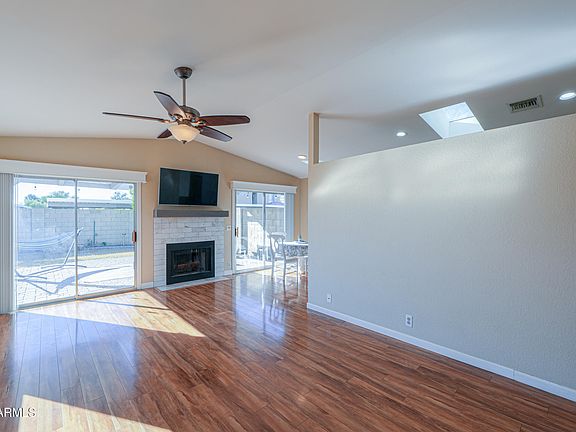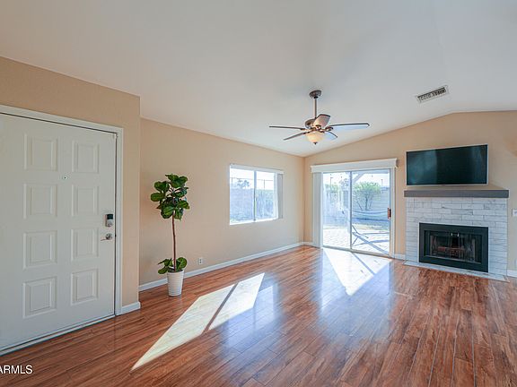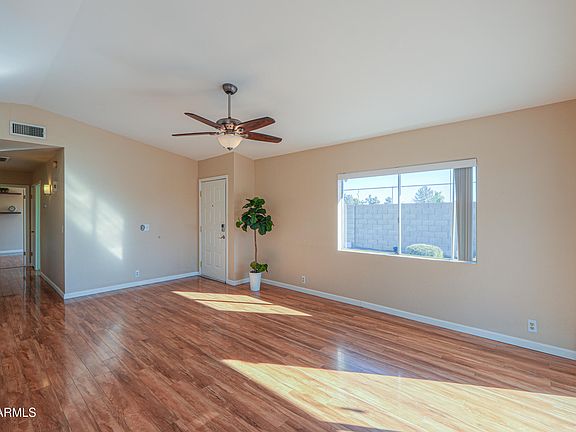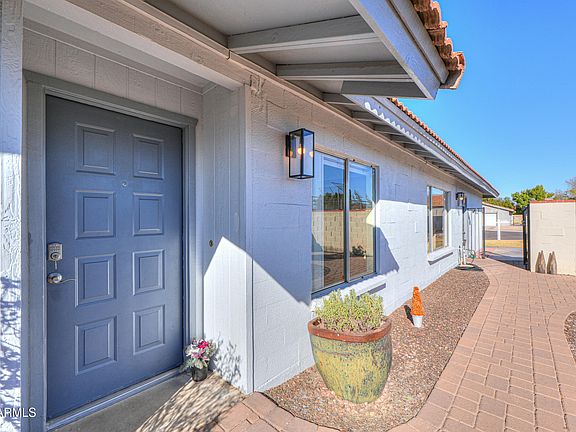Nestled in a cul-de-sac, this charming 2-bedroom, 2-bathroom home offers modern upgrades and a cozy atmosphere. The kitchen has quartz countertops, a marble backsplash, soft-close cabinets, and under-counter lighting, while the bathrooms feature sleek finishes. Natural light floods the interior, enhanced by dimmable lighting and warm wood flooring throughout most of the home. The spacious, private backyard—with no direct neighbors to one side or behind—features lemon and lime trees, perfect for outdoor relaxation. New front yard landscaping includes pavers, gravel, and desert plants, and a water heater installed in 2022 adds peace of mind.