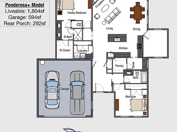 The Creekside Ponderosa Plus has 2 bedrooms, 2 baths and an office. It includes numerous custom features such as metal roof, granite countertops, fireplace, two car garage covered deck, paver driveway, air conditioning, natural gas heating and much more. There are premiums on lots that back to the central greenbelt and to the US Forest Service. Our homes are fully featured with high quality finishes at the base price.