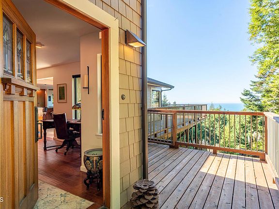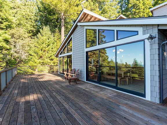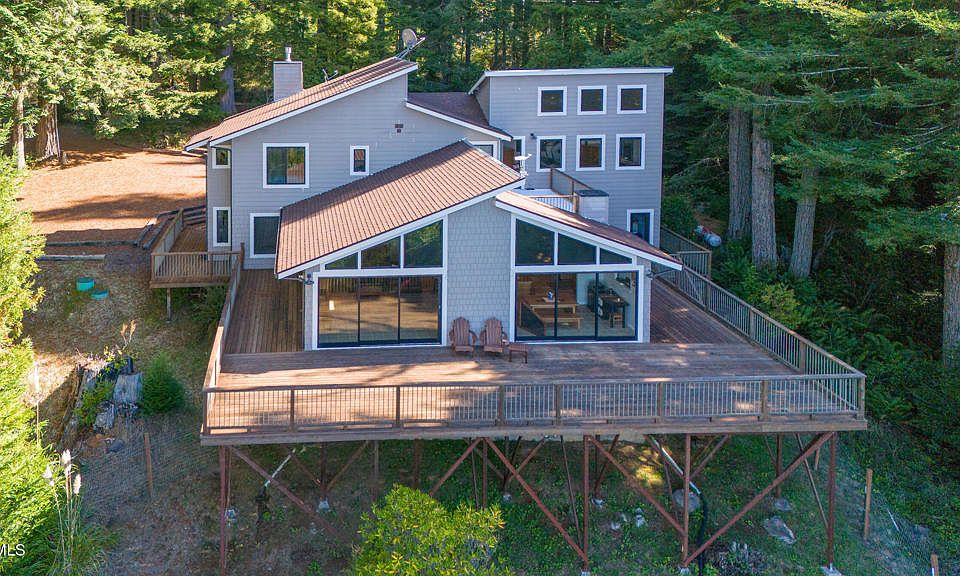Discover the charm of Coastal living in this well-maintained 3-bedroom, 2-bath home offering breathtaking views and exceptional craftsmanship. Nestled on a very private 11 + acre parcel in Little River, this is the end-of-the road privacy people seek for a serene escape by the sea. A perfect combination of ocean views, redwood trees and serenity. You can have it all with this unique home. It features a gourmet chef's kitchen, with custom Cherry cabinets, granite countertops, open concept flow perfect for entertaining, and large windows showcasing the ocean views. Step outside onto the expansive and as-new wrap around decks to take in the panoramic views and fresh ocean air, an ideal spot for your morning coffee or sunset social gatherings. Hardwood floors, radiant heat, custom built-in cabinetry, and thoughtfully-designed living spaces throughout. New roof has just been completed for ease of mind. Upgraded full bath downstairs, and foyer entry/library easily converts to a bedroom with beautiful Murphy bed. Up the stairs, is the primary bedroom with double shower and double sink vanity, separate toilet, and beautiful custom Cherry cabinetry including bed, drawers, nightstands and make-up table. Also on this floor is second bedroom, loft space, and huge game room with wet bar, private deck and ocean views from every window. A whole house generator will keep you warm and comfortable during the occasional power outage. Within walking distance but private, is the 1700 sf +/- geodesic dome which at one time was a music studio for a concert pianist. Studio has running water and bathroom. The property's proximity to the ocean and Mendocino means you're just a short distance away from the sandy shores and miles of scenic hiking trails, restaurants, and amenities. Experience Coastal living at its finest!