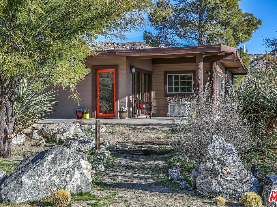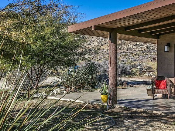 Adorable 1958 brick home on approx 3.4 acres in secluded hillside location in Morongo Valley. This two bedroom, one bath mid-century house has so many delightful features: a wood burning stone fireplace, high ceilings with exposed beams, an open concept living/dining/kitchen area, a den located off the living area, a wall of glass with valley views, an open patio for sunning, covered patio with access to the living room, a fenced horse corral with two shade structures for animals, and scenic views of the valley below and mountains above. The current owner has remodeled the kitchen, added a new roof, and replaced the evaporative cooler. There is a small pump house for the well, and a small shed on property. The property is about a 30 minute drive to downtown Palm Springs, and about 30 minutes to the center of Joshua Tree Village. Cute animals are not included.