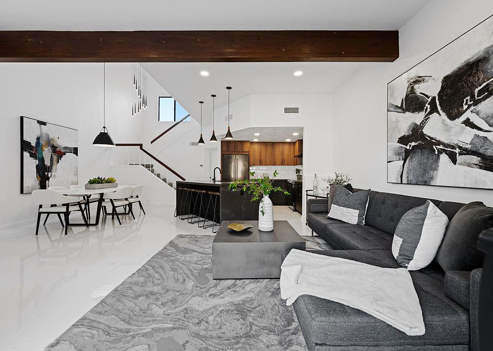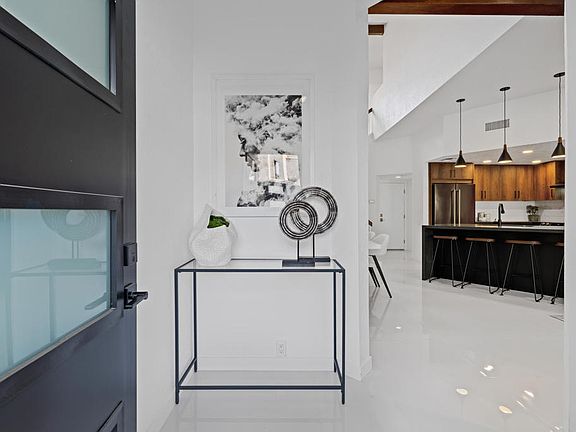 Located behind the guard gated Ironwood Country Club is this spectacular completely remodeled modern home. Enter the gate to the courtyard featuring your own private spa then once you walk through the entry door prepare to say Wow as you take in all the designer finishes in the open great room. The white walls and glossy white tile are strikingly accented with natural woods from the beamed ceiling, stair rail and kitchen cabinets. The great room features a family room, dining room and open kitchen. The custom kitchen has been completely reimagined with a freestanding center island with waterfall sides and pendant lights. The upper cabinetry is a rich walnut accented by lower black cabinets. The Nightfall honed quartz counters are highlighted by the white tile backsplash and black stainless-steel appliances. The ground floor also has a bathroom complete with a tile shower. The dual suite floor plan offers great room separation, and each suite features a remodeled bathroom and outdoor deck with majestic views. The epoxy 2-car garage features a laundry area and built-in storage. Optional membership is available to enjoy the tennis, pickleball, bocce ball, fitness center, clubhouse and 2 private golf courses. This prime location is a short drive to El Paseo shopping district, restaurants, Living Desert, hiking trails and the McCallum Theater. HOA fee includes internet, cable, trash, spa maintenance with a 7 day minimum on rentals! This perfect desert retreat is a must-see.