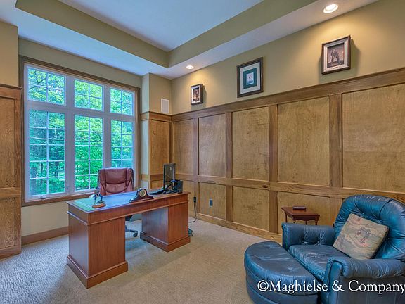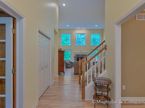 Custom executive dream home, you'll be wowed from outside to in. Enjoy the dramatic entry way w/ 2 story ceilings and stairs leading to the upper level that create a flow of boarder-less space. The Great room stone fireplace is flanked by a wonderful display of floor to ceiling windows showcasing views of majestic mature trees. The slider to the deck extends the living space to a beautiful forest w/ a serene atmosphere. Open plan living gourmet kitchen area includes a built in desk, island, bir ch wood floors, and beautiful custom trim. The main floor master displays a built in bench w/large windows overlooking breathtaking scenery.