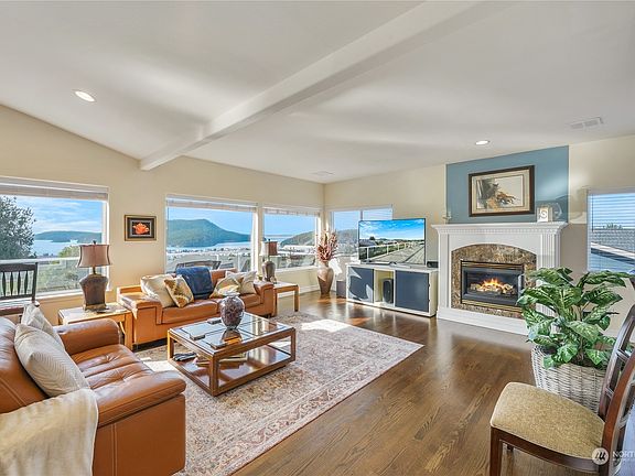 Spectacular marina, island, Burrows Bay & Olympic mountains views! This home is perfect for entertaining with an open great room, kitchen & dining all light & bright with picture windows & vaulted ceiling. Kitchen boasts a ss appliances w/Bosch 5 burner gas stovetop, spacious island with deep sink, pendant lighting and seating for three. Primary bedroom on main level w/direct deck access, walk in closet & ensuite bath w/jetted tub & separate shower. Lower level enjoys 3 bedrooms, bath & rec room with wet bar & covered patio. Bonus feature includes oversize storage room. Mature, professional landscaping with irrigation & sprinkler system. Skyline amenities include clubhouses, marinas, beach access, pickle ball courts, parks & activities!