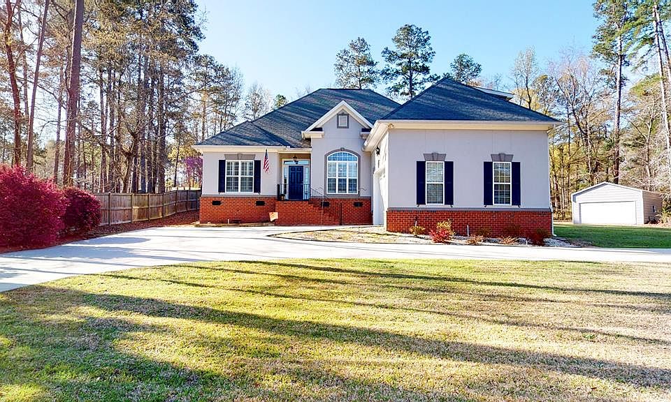 1.5 story home conveniently located on Hardy McManus Rd. close to everything Evans has to offer! Let the foyer welcome you into the great room & dining area w/ hardwood floors, vaulted ceilings, built in cabinet and a cozy fireplace. The breakfast area connects to the sunroom & kitchen. The kitchen features recessed lighting, double oven, granite counters, and gas range. The sunroom leads you to the back deck where you can relax in the hot tub! Enjoy the luxurious master suite which has a private entrance through the living room & boasts a custom walk-in tile shower, double vanities, & walk in closet. Two additional bedrooms w/ a shared bath are also on main floor. The private upstairs bonus bedroom, a full attached bath and walk in closet. This property has an entrance from Halali Farm and a horseshoe drive on Hardy McManus, a 2-car attached garage & 20x20 detached garage/workshop w/ electric. A bit under an acre of scenic outdoor space, this home has plenty of room to entertain!