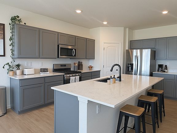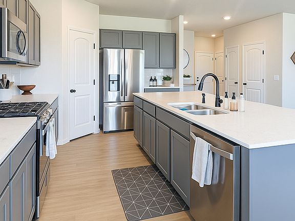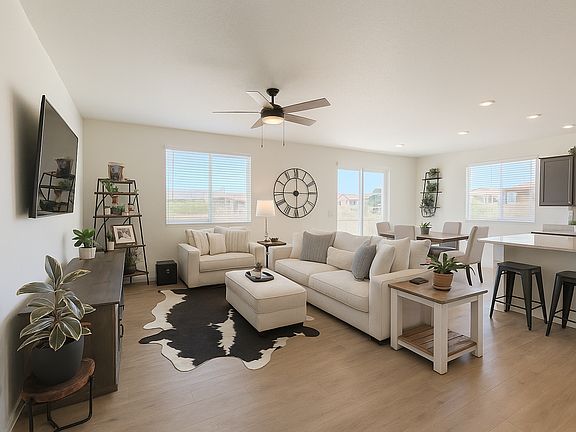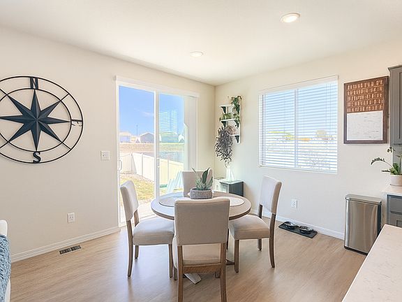 This gorgeous 2024 property is ready for move in! Meticulously landscaped front lawn and covered front porch, grand foyer entry with stunning LVP floors! Warm tones and abundance of natural lighting throughout property! 2 secondary bedrooms with easy access to hall bathroom, upgraded quartz counters throughout home! Open layout common area provides for large living room and gourmet kitchen with large island, stainless steel appliances, walk in pantry and gorgeous cabinetry! Dining area walks out to inviting patio and fenced backyard with breathtaking mountain views! Primary suite features walk in closet and attached full bath with oversized walk in shower and dual vanity! Convenient laundry access and finished garage with epoxy flooring! Located in the Bradley Heights neighborhood with easy access to both Peterson and Fort Carson, hiking trails, native wildlife viewing, Big Johnson Reservoir and Bluestem Prairie Open Space! All that's left is to move in!