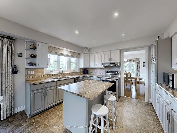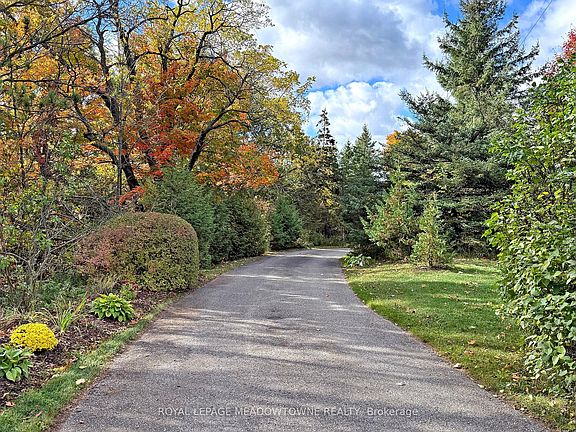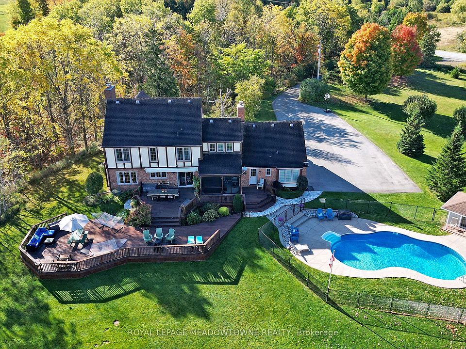 Set on 10 scenic acres, this bright home offers more than 4,000 sq. ft. of living space with the freedom for your family to grow, play, and enjoy nature every day. The large eat-in kitchen includes a walkout to a spacious multi-tier deck perfect for family meals, entertaining or watching the sunrise. The family room features a cozy wood-burning fireplace and a walkout to a sunroom complete with a hot tub for year-round relaxation. An open-concept living and dining room provides plenty of space for gatherings and special occasions. Upstairs, the four generous bedrooms give everyone their own space to sleep, study and play. The principal suite includes a private 4-piece ensuite with a luxurious glass walk-in shower. The finished basement adds even more living space ideal for a playroom, gym, games area, or movie nights plus plenty of storage space. Outdoors, enjoy endless activities in your own backyard. Spend summers by the heated inground pool, explore the property trails all year round and there is room to build a hockey rink in the winter. Harvest apples, pears, grapes and raspberries along with your own produce from the 25 x 50 fenced vegetable garden. Cost-efficient geothermal heating and cooling keeps you comfortable year round. High-speed fibre internet provides reliable service for streaming services, working or learning from home. The long paved driveway leads 10 plus car parking and an oversized 2-car garage with inside access. Recent updates include oversized thermal windows, R-50 attic insulation, new fascia and eavestrough, a pool heater and pump. Property taxes are reduced from the benefits of 2.77 acres under CLTIP tax credits.This peaceful rural retreat sits on the corner of two paved roads and has a Halton Hills address giving you the benefits of 2 Municipal services and conveniently located closer to Georgetown and Acton than Erin. It is just minutes to the Acton GO station and area schools, shops, churches, and golf courses.