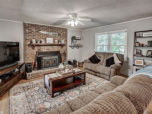 Beautiful home located in established subdivision! Home features huge living room with hardwood floors and brick fireplace with a wood burning stove. Nice kitchen with breakfast nook, stainless steel appliances to remain and a dining room. First floor primary suite with hardwoods, two closets and a full bath. Upstairs offers 2 generous sized bedrooms, one has a big walk-in closet. Covered front porch, patio and double detached garage with huge room for storage over top. Nicely landscaped.