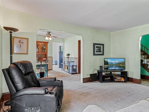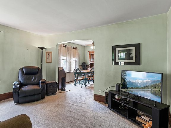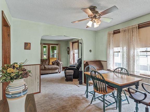 claw foot tub, perfect for soaking. The main level includes a spacious front living room, dining room and back family room. The kitchen has been updated with newer cabinets, countertops, tile backsplash and stainless steel appliances. Hardwood floors underneath carpet. Unfinished basement has potential for more square footage and living space. Don’t forget the 3-season front porch, perfect for morning coffee or nice summer nights. Welcome home!
