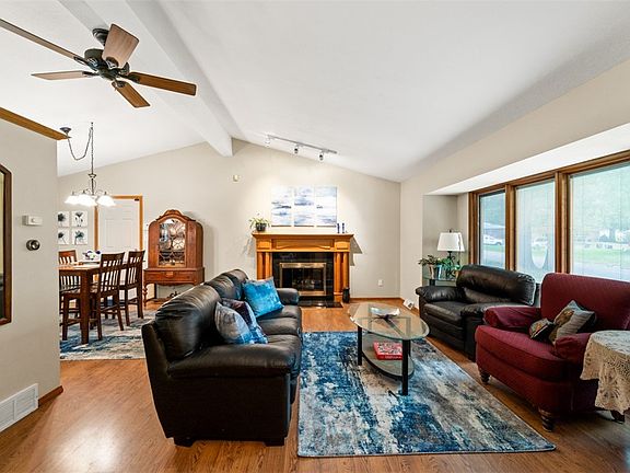 cabinetry. The living room is open with hard surface floors, vaulted ceilings, and a gas fireplace to cozy up to on those