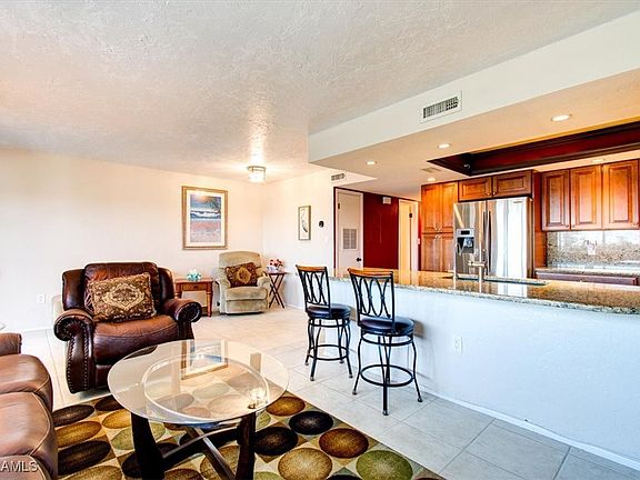 Top-floor PENTHOUSE unit with elevator access, offering ultimate privacy—no neighbors above for peaceful living! This TOTALLY UPDATED fourth-floor condo is a true gem. The gorgeous kitchen features wood raised-panel cabinets with pull-out drawers, stainless steel appliances (including a Bosch dishwasher and double oven), plus granite countertops and backsplash. A breakfast bar and dining area sit just off the kitchen, leading to a spacious great room with stunning cityscape views. Both bathrooms have been beautifully updated with granite countertops, raised-panel wood cabinets, and new fixtures, including toilets and shower doors. TURNKEY ready! Additional features include a new A/C with UV (installed in 2018), new water heater (installed in 09/2024), a water purifier in the kitchen, RING doorbell, digital thermostat, and hurricane windows on the lanai. The building has been recently upgraded with a new roof and gutters in 2023. Located in the heart of Cape Coral's downtown, you can easily walk or bike to the Yacht Club, beach, restaurants, and shopping. This is a 55+ community perfect for seasonal stays, vacation getaways, or year-round living. One assigned parking spot is included, with additional guest parking available. Enjoy a large, well-maintained pool and one of the lowest HOA fees in Cape Coral at just $620 a month, including water and sewer.