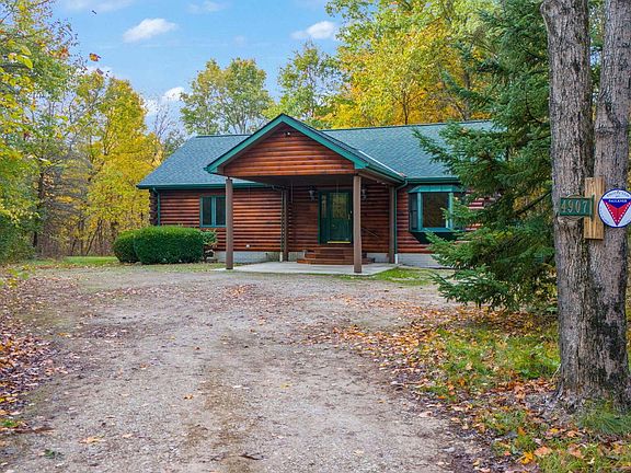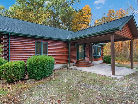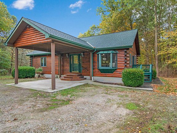 Is your dream to own a log cabin set back in the woods? If so, this little slice of Heaven might be just what you've been waiting for! This impeccably maintained 1-story home offers 2 bedrooms, 1 full bath, & a 1st floor laundry room! Enter through the covered front porch and be immediately greeted w/ a warm & inviting atmosphere! A vaulted family room w/ hardwood floors & natural wood beams as well as a convenient dining room is located directly off of the kitchen. The desirable open kitchen features an eat-in island w/ corian counters, beautiful cabinetry & tile backsplash. Opportunity awaits in the full, poured basement with plenty of room to add additional living space. Step out back & enjoy the sounds of nature & changing fall leaves on your private land. A one of a kind home!