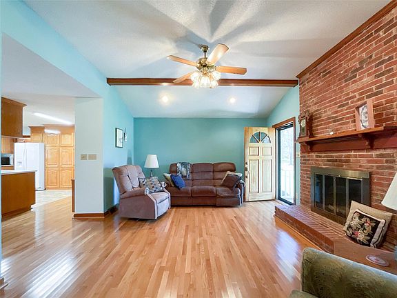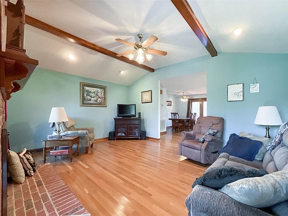 Cute, cute, cute living area off kitchen with raised ceiling featuring exposed beams and original fireplace with gas logs for a cozy evening.