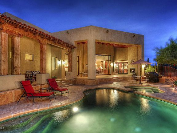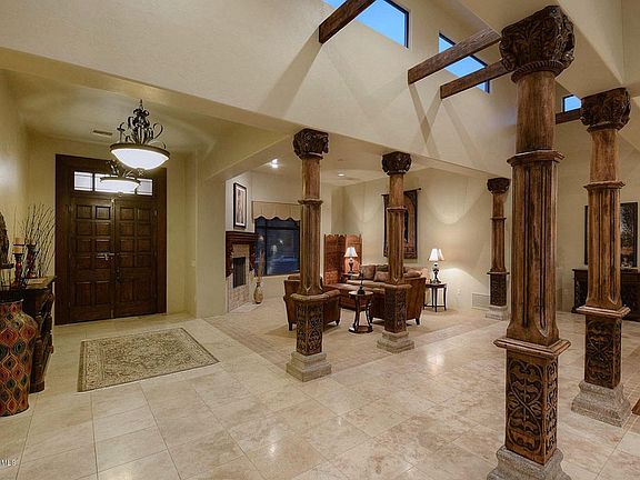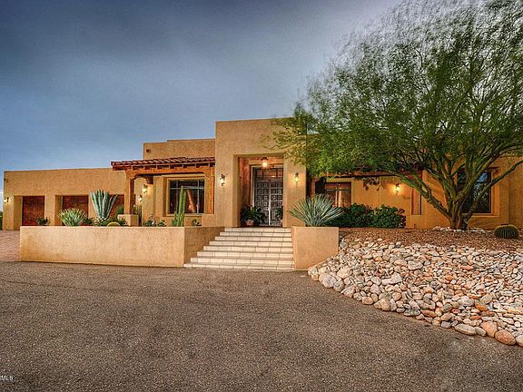 Outstanding 2006 four bedroom southwestern contemporary on 1.11 view lot with 4592 sqft on a cul-de-sac in the near Catalina Foothills with city and mountain views. Enter through old world double front doors into great room with soaring 18' ceilings, 11' windows with views and lots of light, travertine and in-laid wood flooring, eight old world hand carved wooden pillars, large cantera stone fireplace and 8' alder doors throughout. Gourmet kitchen offers GE Monogram SS appliances, five burner gas stove, granite counters, built in wine cooler and custom alder cabinets. Old world double doors lead into gracious master suite with tumbled marble fireplace, oversized walk-in shower, glorious his/hers finished closets with cabinets and sitting or exercise room off master bath.
