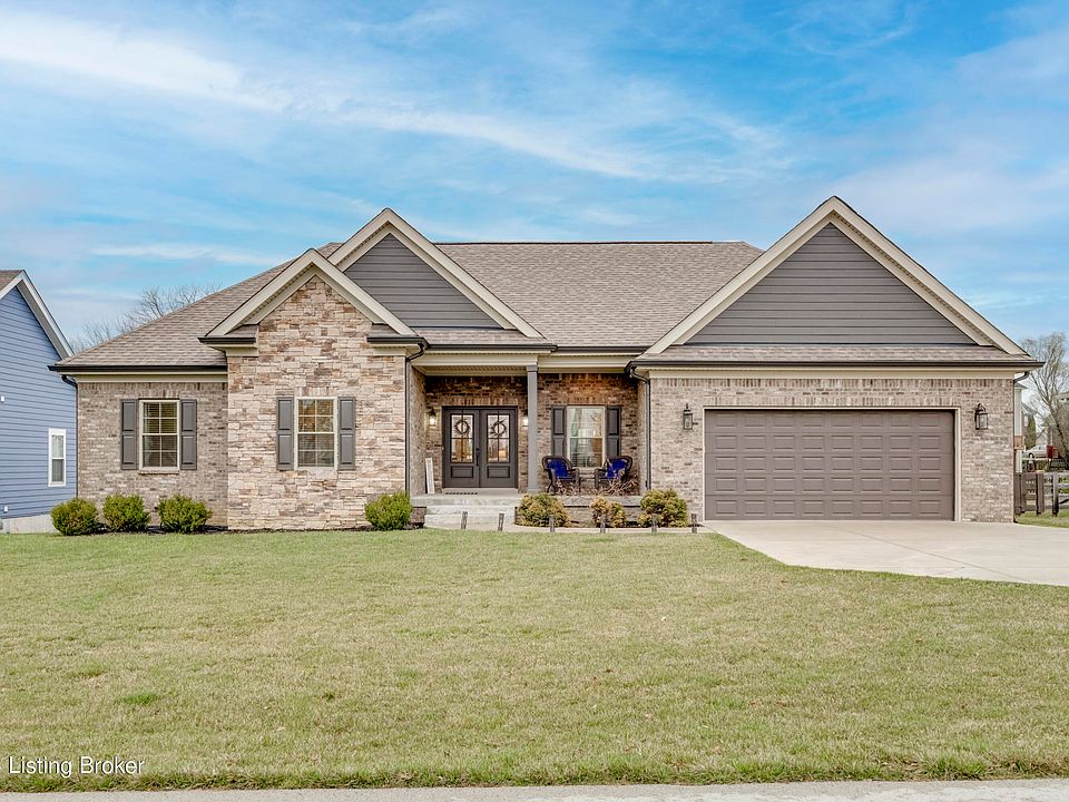 Close to everything, Location, Location, Location! This house has it all in spades! Searching for something more distinctive, and not just the same white kitchen & farmhouse style, well look no further! Welcome to this lovely blend of Craftsman and French country, all brick walkout ranch with distinctive features like dark trim and stone on the front AND almost LIKE NEW construction! Inside you will find 3500 sqft of finished living space, 5 Bedrooms, 3 full baths open concept, GOURMET KITCHEN with GRANITE, custom stone subway tile backsplash and 5 burner GAS cooktop, 2 covered decks, 1 covered patio, fenced yard, sits just outside 3 neighborhoods on quite street but NO HOA on nearly 1/2 acre with Golf Course view from welcoming covered front porch. Close to everything, 2 miles from 71, 1 mile from school campus, 1 mile from Wendell Moore Park with miles of walking trails, a beautiful fishing lake, new pool opening this summer, play ground, tennis & pickleball, Oldham County Country Club view, less than 2 miles from brand new Kroger Marketplace and exits to 71, can get to all the wonderful shopping and charm of downtown lagrange 'the kindness capital of ky' and then to the east end for all the amazing options to shop and dine in just 15 minutes, and only 20-30 min drive to other parts of the city. This home also sits right across from the Oldham County Country Club, with a beautiful view of a green and tee box from the front porch. Oversized garage with additional space to park a golf cart, have extra storage or a workshop. On the main level you will find an open floor plan with a huge chef's kitchen, dining area, access to a covered deck that the current owner uses for his dedicated grilling area, large great room with floor to ceiling stacked stone fireplace, coffered ceiling with decorative wood inlay, and access to a second cover deck. On the main level you will also find 3 bedrooms and 2 full baths. The large primary bedroom features a trey ceiling and with an ensuite bath with a custom serene white subway tiled shower with aqua glass accents and oil rubbed bronze fixtures, and a large walk in closet. Also, on the main level you will find high end gorgeous tobacco stained with a reclaimed finish engineered hard wood flooring, and upgraded carpeting in the bedrooms. There is also a large pantry and laundry room making one floor living so convenient and easy to maintain. Heading down to the lower level you will find 2 additional huge bedrooms, a third full bath, an exercise/flex room, areas that can be used for games, office area, craft area, room for a kitchenette to be added, and a large media area, plenty of unfinished storage as well as a storm shelter/safe room built under the porch, and premium LVP flooring in the main areas and upgraded plush carpet in the bedrooms. The basement also has a walk out covered patio that walks out to a huge fenced yard. The yard is perfect for games, fire pit, a pool and more, with no HOA you can have more freedom to finish it to your taste! But wait this isn't all, this home is five years new, and the owners not only finished the basement but they also added an irrigation system, fenced in the back yard, added a water softener, a backup generator system, a back up sump pump, and added a French drain system in the back yard.