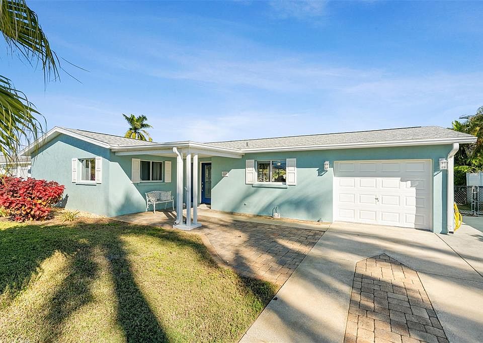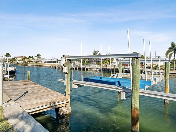 A rare deepwater opportunity in Bay Colony—Manatee County’s best-kept secret for serious boaters. This non-deed restricted waterfront community features the widest and deepest canals in the county, no HOA fees, and direct Gulf access—perfect for those who live life on the water. This fully updated 2-bedroom, 2-bath residence offers 1,519 square feet and sits directly on a deepwater canal, allowing you to keep your boat just steps from your back door. The property includes a 7,500-lb boat lift and a 22-foot dock—a rare setup in this price range. Enjoy tranquil canal views from the expansive backyard paver patio, designed for waterfront entertaining, morning sunrises, and sunset cocktails. A 220-volt outlet is already in place for a hot tub, enhancing the outdoor living experience. Inside, the home has been completely renovated featuring white quartz countertops, custom white cabinetry, and premium stainless-steel appliances. Original terrazzo flooring preserves mid-century character, while updated spa-inspired bathrooms elevate the space. Recent capital improvements within the past year include a new roof, new HVAC system, new water heater, and new irrigation pump. A large canal-view storage room offers flexible use as an office, captain’s room, or gear storage. Hurricane shutters provide added security. Conveniently located near I-275, I-75, US-41, US-301 and the Skyway Bridge, offering quick access to St. Petersburg, Tampa, Sarasota, Bradenton, and open water. Boating season is just around the corner, so hurry and put this one on your list today, before another buyer is enjoying your lifestyle in your house!