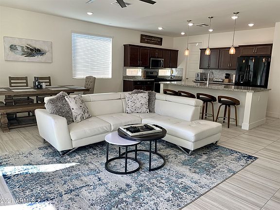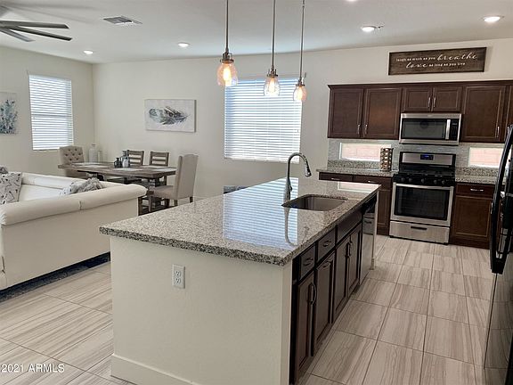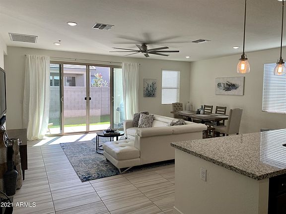 Model perfect home with upgrades galore! This home features a split Dual-Master configuration, with large walk-in closets in both bedrooms. Open kitchen with granite countertops, island, stainless steel appliances and HUGE pantry. Upgraded flooring. Spacious great room with 12' wide glass sliding door leading to large covered patio and easy care backyard with custom turf. Enjoy all the amenities in the Award-winning community of Eastmark with an exclusive community center, resort style pool, splash pad, over 25 parks, and top-rated schools. Near freeways for easy commute, and shopping and dining. Don't miss this Gem!