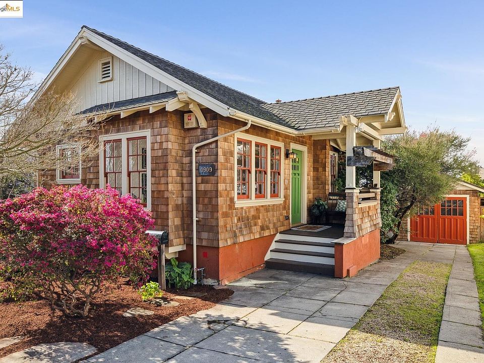 This classic wood-shingled Craftsman is an architectural jewel box. Its enchanting curb appeal sets the stage for a storybook living experience. The light-filled living room is a showcase of craftsmanship, where double-hung windows and gleaming hardwood floors with intricate borders highlight the home’s character. A graceful arched entry leads to an airy sitting nook, the perfect retreat for remote work. The shared bath blends vintage charm with a modern edge, featuring a classic clawfoot tub paired with bold wallpaper for a playful yet refined contrast. Two generously sized, sunlit bedrooms sit at opposite ends of the home, offering both privacy and comfort. The eat-in kitchen is distinctive and functional, crowned by a striking skylight that illuminates its unique copper countertops. Designed for connection, it opens to a private deck, with stairs leading to the backyard—a lush retreat for gatherings, gardening, and play. A bounty of fruit trees, from avocado and Meyer lemon to persimmon, peach, fig and more, brings a seasonal harvest to your doorstep. A detached garage adds an extra layer of potential—whether as a creative studio, gym, or future conversion. Tucked on a quiet street, this home offers the perfect balance of serenity and accessibility—minutes from essentials.