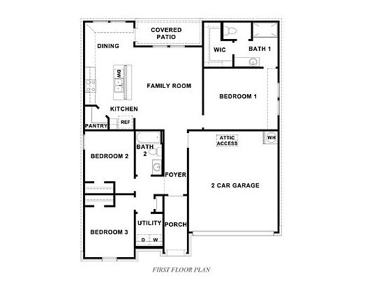 The Ashburn plan is a one-story home featuring 3 bedrooms, 2 baths, and 2 car-garage. The entry opens to the guest bedrooms and bath with hall linen closet. The kitchen includes a breakfast bar with beautiful counter tops, stainless steel appliances, corner pantry and opens to family room. Bedroom 1 offers privacy along with attractive bathroom features such as dual vanities, water closet and walk-in closet. The standard rear covered patio is located off the dining area. You’ll enjoy added security in your new DR Horton home with our Home is Connected features. Using one central hub that talks to all the devices in your home, you can control the lights, thermostat and locks, all from your cellular device. DR Horton also includes an Amazon Echo Dot to make voice activation a reality in your new Smart Home on select homes. With D.R. Horton's simple buying process and ten-year limited warranty, there's no reason to wait. (Prices, plans, dimensions, specifications, features, incentives, and availability are subject to change without notice obligation)