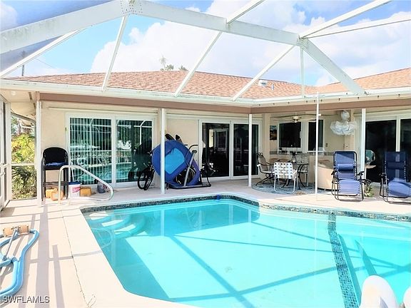 Amazing swimming pool with screen Lanai, 3 Sets of Impact & Insulated doors and Windows!and entertainment area all nestled into tropical landscape looking over to one of the most sought-after waterways in Cape Coral Florida.