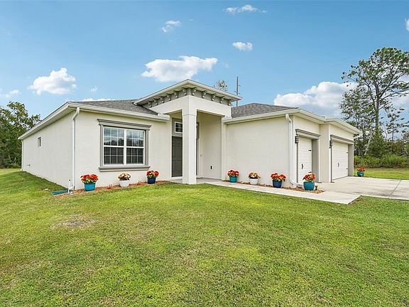 Welcome to this beautifully designed 4-bedroom, 3-bathroom home in the sought-after Kingsland Country Estate. Built in 2022 and set on just under half an acre, this 2,370-square-foot property also includes a separate office that can easily serve as a fifth bedroom. Step inside and you’ll be greeted by an open layout accented with elegant archways leading to the main living area. The formal dining room adds a touch of sophistication, while the spacious living room flows seamlessly into the kitchen. Here you’ll find quartz countertops, a modern backsplash, a breakfast bar, and stainless steel appliances. The primary suite is a true retreat, featuring tray ceilings, a large walk-in closet, and an en suite bathroom with dual sinks, a soaking tub, and a walk-in shower. The split-bedroom floor plan offers privacy, with all bedrooms featuring new high-end carpet and bathrooms enhanced with granite countertops. Luxury vinyl flooring runs throughout the main living areas, creating both style and durability. Relax or entertain outdoors in the covered, screened-in lanai that overlooks the spacious backyard. A 3-car garage completes the home, offering plenty of space for vehicles and storage. Conveniently located near grocery stores, shopping, golf, and nature reserves, this home offers both comfort and convenience in a desirable setting. Mortgage savings may be available for buyers of this listing.