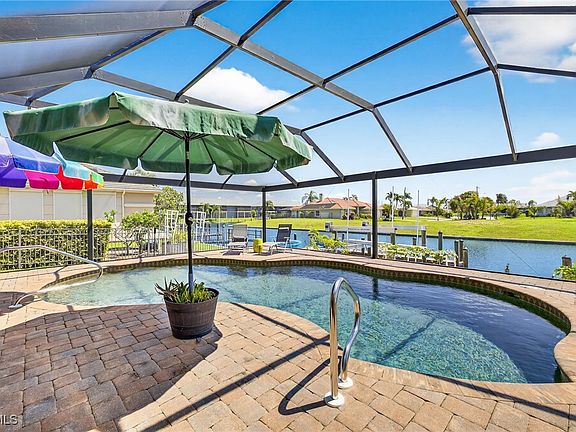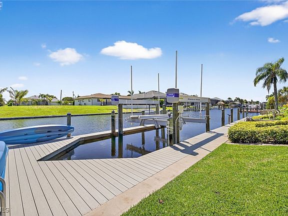 Cape Coral is home to this wonderful Gulf Access Pool Home! This property offers a gorgeous pool, three bedrooms, a living room, and a family room, creating a comfortable and spacious living environment. A highlight of this property is the impressive 80' composite boat dock, complete with a 30' Captain's Walk, a hefty 16,000# lift with a generous 12' beam. Enjoy the convenience of sailboat access with NO bridges! It is approximately a 15-minute boat ride to the canal exit at the south end of Cape Coral, and it's conveniently close to two marinas, perfect for the boating enthusiast. This property features an oversize, well-manicured lot situated on a peaceful cul-de-sac. The spacious, 106 ft. wide lot offers privacy and ample lawn space, complemented by 106 ft of seawall with convenient boat docking. The home has been upgraded with new impact windows and sliders for enhanced security and energy efficiency. Furthermore, it features a newer 2023 stone-coated steel hurricane shake Pro Line roof, a significant investment with a $43k value and a transferable 50-year warranty, ensuring long-term protection. Inside, the home is impeccably maintained with tile flooring throughout. It is located in a beautiful and convenient area, offering easy access to restaurants and shopping destinations. Key amenities are nearby, including Publix, which is less than 2 miles away, Sanibel/Fort Myers Beach bridges are only 12 miles, and the airport is a short 16-mile drive. [All measurements are approximate]