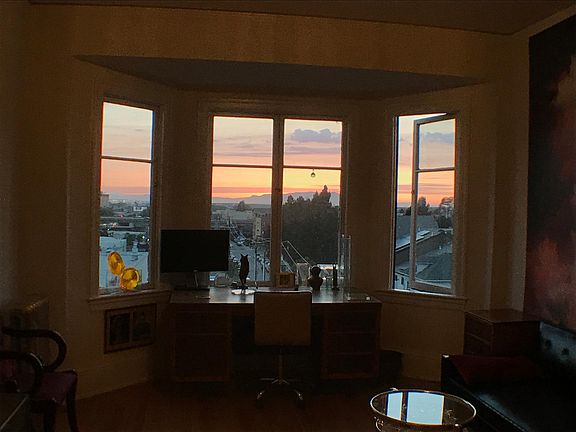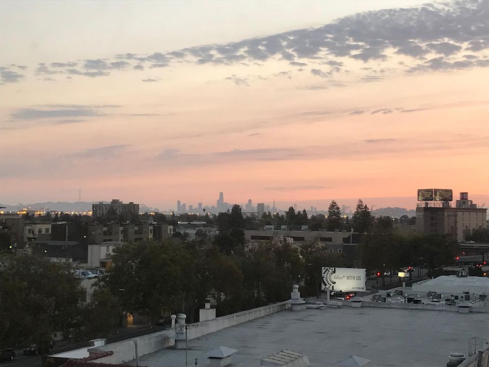 Gorgeous, sunny studio atop 100-year-old building. Separate eat-in kitchen. Sweeping views of San Francisco and Marin, Berkeley and the hills, and nearby Uptown Oakland. Roof access right down the hall. Central location, surrounded by art galleries, restaurants, cafes; 4 blocks to 19th St. BART, 2 mins. to freeways. Bay windows in both the main room and the separate eat-in kitchen. Great light all day; sunrise over the hills from the kitchen table, sunset over the Bay. Hardwood floors. New maple kitchen counter. Chambers stove and other classic touches like an icebox and trash chute. Full bath, three closets.* *The bed is inside the walk-in closet that originally housed a Murphy bed. At 41" x 91", the twin mattress fits in neatly with room at the foot. The bed can go out in the main room, but you might just find that the sound/light cocoon gives you the best sleep of your life. Elevator (2 steps at building entrance, so not wheelchair accessible). Recently updated building fire alarm system. Furnished, with fully equipped kitchen, and linens. Mid-Century Modern couch. Video projector and Bluetooth sound bar + subwoofer with Apple TV; TV with Amazon Fire TV; computer monitor. Coin washer/dryer in the building. (I added curtains in the main room after these pics were taken.) Central location for bars and concert venues, a range of restaurants from takeout to fine dining, coffeehouses, bakeries, boutiques. The historic Fox theater is within view straight down Telegraph, and the New Parkway beer + movie house is two blocks away. WALK - Walkscore.com grades the location a 98 ("Walker's Paradise") and 95 "Biker's Paradise"). - Koreana Plaza groceries 1 block, Whole Foods 10 mins., Sprouts 13 mins. RIDE - Four blocks to 19th St. BART station (13 mins. to SF). - Right off Telegraph/Grand bus stops for day and night service to Berkeley, as well as the Night Owl bus from SF. - Two blocks from free Broadway shuttle to Oakland City Center, Old Oakland, Jack London Square. DRIVE - Around the corner from 980/580. - Street parking; various lots and garages available nearby (last time I checked, the YMCA garage was $100/month). I'm subleasing my apartment for six months or possibly longer. Move-in date is flexible anytime from now till October 1. $1600/mo. rent + $1600 deposit. Gas/electric not included. Wifi, heat/water are included.