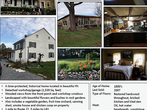 Beautiful home for a residence or business. Zoned agriculture thus there can be a lot of imagination with the purchase of the home and workshop, when seeking a variance for Bed and Breakfast or business. The property is nestled on a quiet road close to everything necessary. I have staged many events for baby and wedding showers, picnics and a gala wedding extravigamza. Excellent for RV enthusiast with RV parking. RV World and two other centers 2-3 miles from home on rt 22. The property includes an outside original canning shed, original smoke house and a large workshop built in 2008 for the craft man and includes a garage. 5 bedrooms including a loft, all with unusual ample closet space. Five staircases and adds to the sense of expansive room. The house heats by oil and water baseboards. The wood stove adds extra cozy heat if desired. The house will not require the use of oil most of winter. The walls with "Kings" wood logs are insulated and keep the house warm in winter and cool in summer. The house is delightfully historical with unique hardware and hardwood floors throughout the house. The downstairs is open in design. Attic in insulated, enclosed floor and sides and also painted. Ready for a room to be designed. Pump for well just 6 years old, and a roof place inn 2016! Two porches in the front back. Each porch is tiled. There is a tiled room that has stone for walls and the kitchen has brick for the floor with tiled back splash. The solid basement with metal beams has been pointed and is clean and comfortable. It has a room ready to be developed. The gardens are well-established blooming constantly all spring, summer and fall. Detailed history of the house is available. Wildlife abound and the yard has been landscaped for easy mowing. Traffic is very light and quiet is the road though very close to activity. It feels like remote living yet active RT 22 is but one mile away with every store you could desire. Excellent school district near by and ample sports activities. Harrisburg just 20 minutes away for night life. 1 mile from rt 22 and 81.