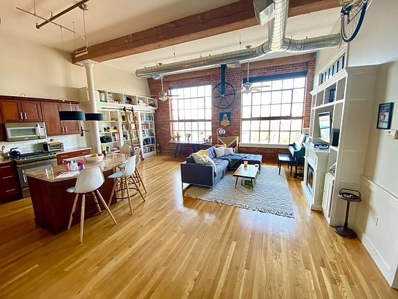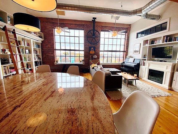 MUST SEE! Sunny, spacious, 2 BR 1½ BA loft. The open kitchen/living w/ 14 ft ceilings, is fabulous for entertaining. Massive windows provide canal and downtown views w/ stunning sunsets at back of building away from street. Well-planned chef’s kitchen with granite counters, top of the line SS Frigidaire Professional appliances with gas range, plentiful cabinets and deep drawers, island for extra prep space & storage. A hallway leads to 2 good sized BR's and full bath with a tiled glass shower. Stacked washer/dryer in BA closet. Master BR has custom closet built-ins & custom room-darkening drapes. Easily accessible loft areas above each BR provide plenty of storage, custom, built-in bookcases with sliding library ladders. Efficient heat, central air, radiant heat fireplace, 4 yr old water heater. The building produced machinery for textile mills. Several pieces are preserved & mounted in this unit adding history. Close to downtown events/restaurants. Electric vehicle parking onsite.
