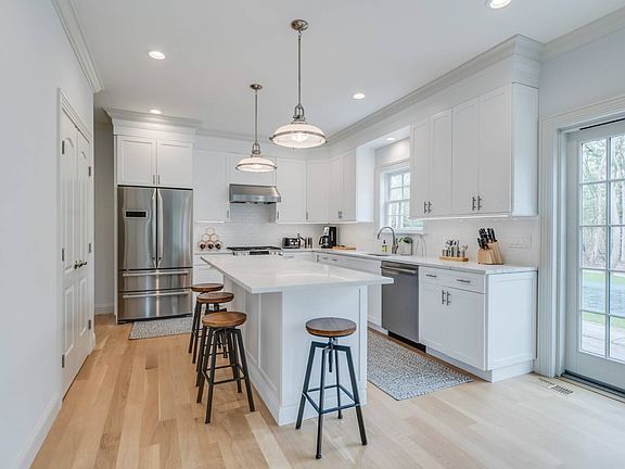 sq. ft. traditional provides four bedrooms and three and a half baths - all beautifully finished and appointed (which only new constructions bring you). Enter from the front porch to serene and light-filled living areas flowing among the living room with cozy gas fireplace, well-equipped eat-in kitchen with stainless steel appliances, quartz countertops, island with seating and glass doors to the deck and pool. There is also a formal dining room, and an attached two-car garage. Upstairs find the master suite featuring a luxe bath with frameless glass-enclosed shower, deep soaking tub and marble tiled floor. Another en-suite bedroom and two additional bedrooms sharing a bath are also on this level. Outdoors enjoy peaceful privacy as you relax by your heated pool in summer ... head to the nearby ocean beach, or the village where you'll find a variety of restaurants and shops, the Westhampton Beach Performing Arts Center, a popular Saturday farmer's market, concerts and other events, and lots more to enjoy over the holidays and/or for summer!