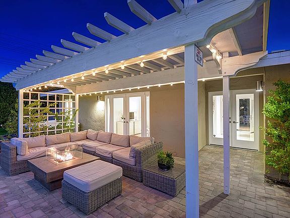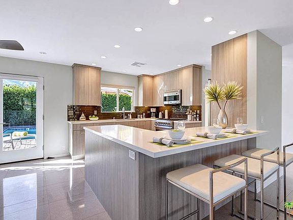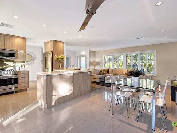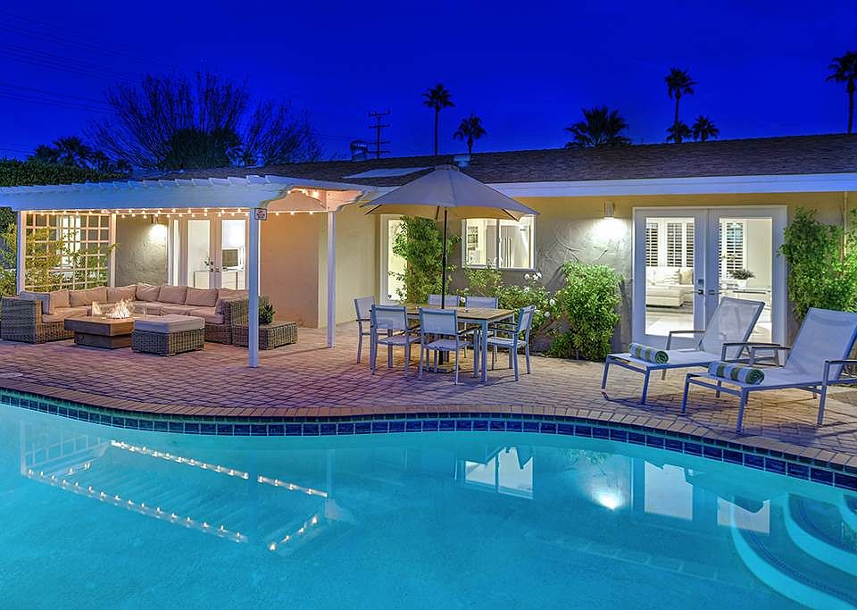 Private, stunningly renovated Central Palm Springs private gated compound designed for outdoor living. Surrounded by desert landscaping, large front gated entertainment patio, block walls with high ficus for privacy in back, this lovely home will delight the most demanding modernist buyer. Re-imagined open entertaining areas with white quartz counter stainless kitchen. Beautifully redesigned baths, dual glazed French doors and windows opening to mountain views and lovely pergola covered patio for relaxing and outdoor dining. Lovely master suite with walk in closet and renovated bath. Two other bedrooms with hallway bath offer privacy from guests. Laundry room off kitchen and epoxy floor garage with bonus office/workroom with AC. Newer stainless appliances, newer high efficiency AC, newer pool pump. See attached list of improvements. Good short term rental history. See Doc attachment for list of improvements.