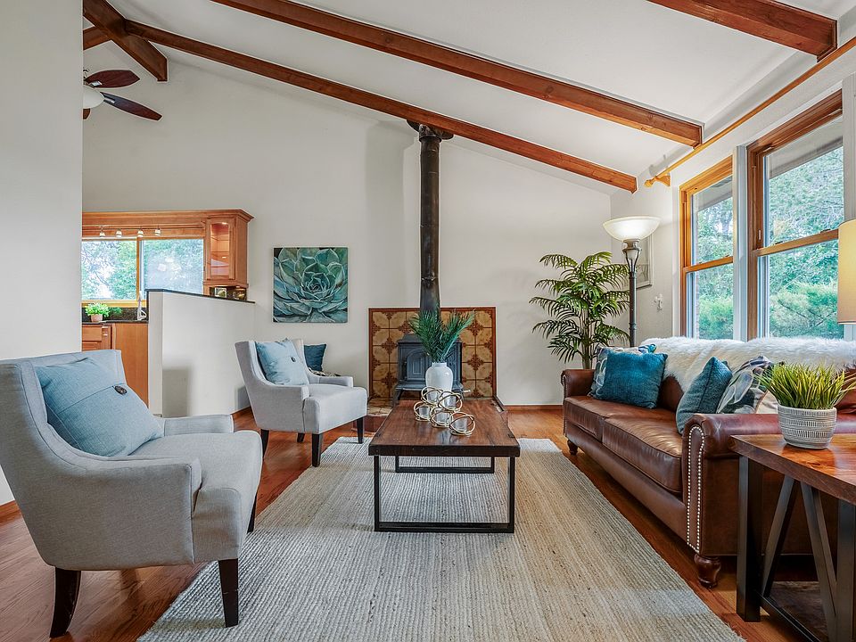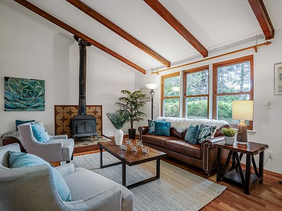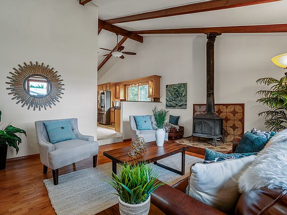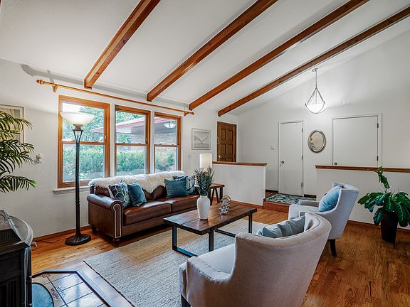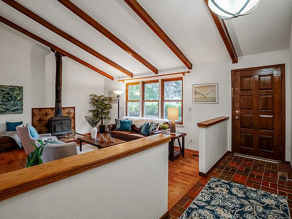 Welcome to 491 Ridgecrest Ave, a spacious and inviting home offering nearly 2,600 square feet of living space, 4 bedrooms, 3 bathrooms, solar panels, and a 2-car garage. The first living area welcomes you with vaulted wood-beamed ceilings and a wood stove, creating a cozy ambiance. At the heart of the home is the beautifully updated kitchen, complete with stainless steel appliances, rich maple cabinets, a large island with a utility sink, and a wine fridge. This space effortlessly connects to the dining area, which boasts vaulted ceilings, a fireplace, and plenty of room for intimate dinners or larger gatherings. The main section of the home features two generously sized guest bedrooms, a full hall bath, and a primary bedroom with an en-suite bath. All bedrooms have gorgeous maple-engineered hardwood floors, creating a clean, modern look. A thoughtful addition to the home expands the living space even further, opening up to the backyard and offering an upstairs private primary suite with vaulted ceilings, abundant natural light, and an ensuite bathroom—providing a tranquil retreat from the rest of the home. The backyard is a gardener's dream, with an almond tree, two Asian pear trees, a cherry tree, and a storage shed. Enjoy updated windows throughout and a 5kW photovoltaic solar system for energy efficiency. Radiant electric floor heating in the dining area, part of the kitchen, and the addition ensures warm, comfortable winters.This home offers a perfect blend of style, function, and room to grow. Don’t miss out—schedule your showing today!