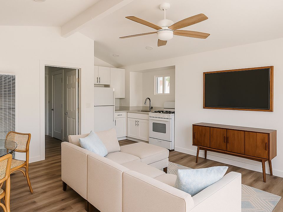 Furnished, stylish, beach cottage with fenced yard, private patio, 2 off-street parking spaces, and laundry in a quiet neighborhood 5 blocks from the beach in Midtown Ventura with the beach and pier, restaurants, grocery, and other conveniences within walking distance. Available for month-to-month rental.