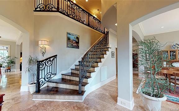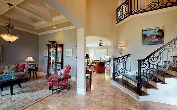 You could not build this home for this price. Every part of this home is a WOW. Excellent construction with European style. Dramatic entry with beautiful entry doors, Sweeping wide curved stairway, High custom ceilings, Chamfered/curved walls, arches, Oversized doorways, large casement windows with transoms, Custom Cabinets in kitchen with curved tops, hidden accent lighting, huge island overlooking great room and large covered porch with wood burning fireplace and huge TV. Travertine tiles, Marble floor in 2nd floor bath, Curved Dramatic Ceiling in Master Bedroom and 2nd floor bedroom. All baths are tiled with extra features, art niches, high sinks. Recessed lighting in ever room, dramatic wall sconces and high end light fixtures throughout, Huge Bonus rm could double as a art/office,billiards, play room and still have plenty of space as a media room. Professionally landscaped walk thru natural gardens lead to curved bridge & stucco storage bldg w firepit. Outside patio w gas outlet