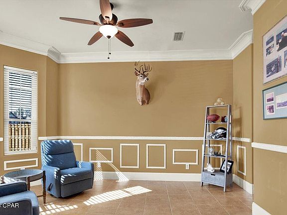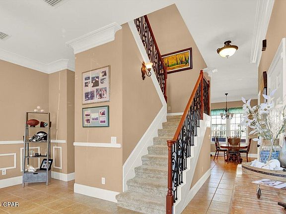 Dividing the kitchen from the living room is a three-sided natural gas fireplace. The living room leads to a beautiful backyard pool area. The back inside stair rails are made of black iron (see photos). There is 10'' crown molding and 7'' baseboard throughout this home, even in the closets. The owner has certainly paid attention to detail. The master suite is luxurious with a large bedroom and awesome sunken tub with separate tiled walk-in shower and double sink with granite counter tops. The second floor also accommodates two additional bedrooms with full bath/ Jacuzzi tub. The laundry room is also conveniently located near the bedrooms upstairs. The home has a brick paver driveway and walkway. High-grade Schwinco windows. Fully landscaped with a sprinkler system. Property is minutes to the mall, schools, Tyndall Air Force Base, hospitals, shopping, etc. All measurements are approximate. Please measure for accuracy