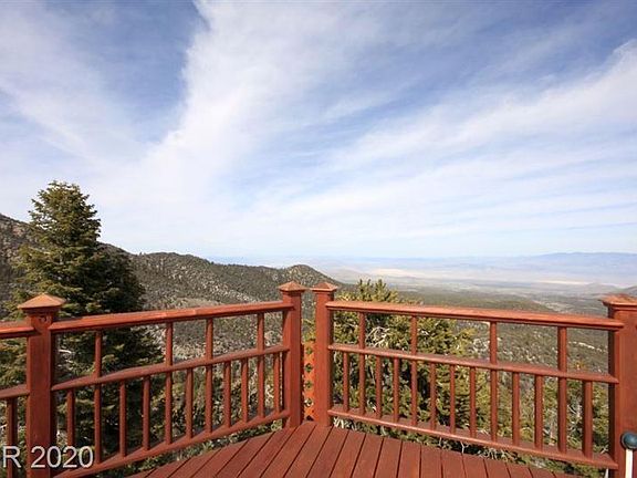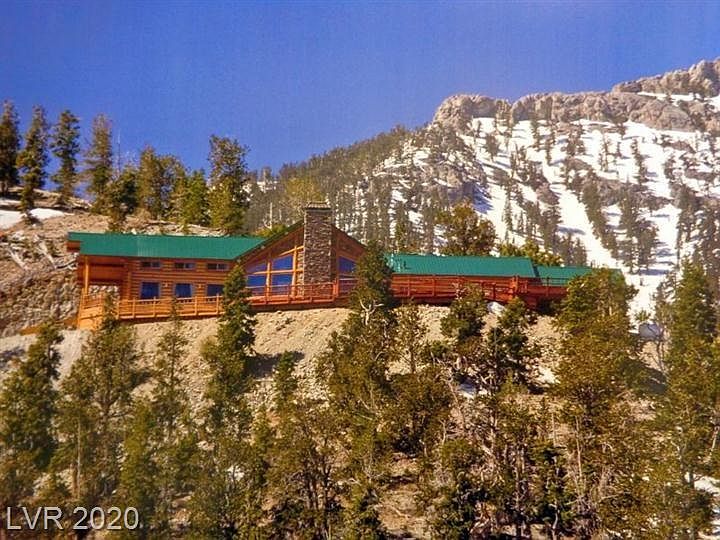 The ultimate, luxurious mountaintop estate featured on Epic Log Homes! Stunning views of Toiyabe Nat'l Forest/long-range/city+Lake Mead views! Located so close to Las Vegas in the bristlecone pines & sited at the highest elevation in Southern NV at aprx 9,125'. Off-the-grid/solar powered. Aprx. 4100 sqft/4.64ac. fully private & separate. Opulent rustic/lodge-like interior. Luxury finishes-Venetian plaster/hardwood floors/stainless aplncs/granite.