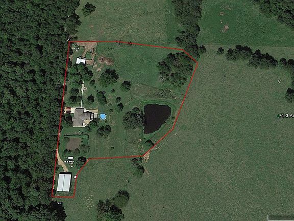 Secluded 2,246 sq. ft. Brick Home on 5 Acres!! The Home is all brick & very well laid out w/ main floor having 2 living areas, Kitchen/Dining combo, split Bedrooms & 2 baths. Large upstairs bonus room. Extra features include hardwood & tile flooring throughout, custom cabinetry, an island, wood doors, a Stone fireplace and a Gas fireplace. 644 unfinished sq. ft. in the Basement area was converted from a garage but seller has everything to return it to a garage or you can finish it for extra space. Large Deck on the back over looks the large stocked pond. Add a 2 car carport, above ground pool, covered front porch, 40x56 Metal Barn/Work Shop, Shed w/tack room, dog kennel, loafing barn & a mature landscaped yard w/fenced garden area, fruit trees & grapes. 76.3 Acres available MLS#6007899!