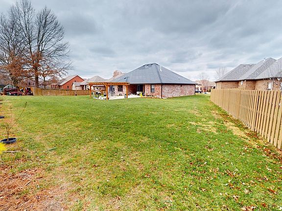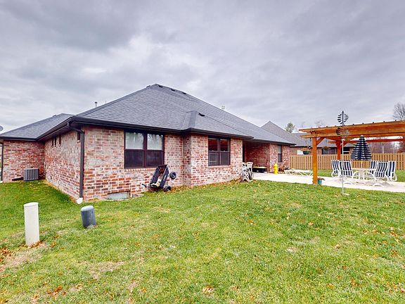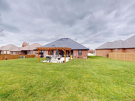 Gorgeous brick and stone home with a stunning Douglas Fir pergola for gathering under in the backyard. The open floor plan welcomes you in instantly to the stunning living room with warm fireplace and access to back yard ( the big screen TV stays). The area shares the bar with seating option if you want. An open kitchen with a well planned work flow and the refrigerator stays. Dining area is off set, but still open and inclusive. Split bedroom plan with the master bath boasting a soaker tub, dual vanity, and walk in closet. The remaining bedrooms are nice sized and have ceiling fans. The main bath is perfect for growing families with a dual vanity for the busy mornings. The yard has sprinkler system. HOA includes trash pickup, pool, work out room, and fellowship hall.