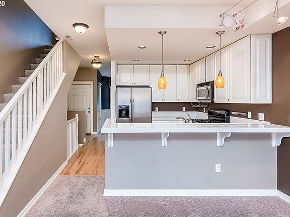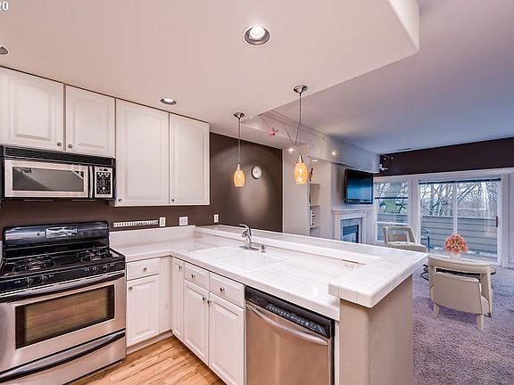 Pristine townhome in prime SW Portland location minutes from OHSU, South Waterfront, downtown Portland, & John's Landing shops & eateries. Kitchen boasts SS appliances, crisp white cabinetry, & breakfast bar. Living room w/cozy gas fireplace flanked by built-in shelves, & slider to deck. Elegant formal dining room. Vaulted master suite has large closet & private bath w/jet tub. 2 additional spacious beds one w/attached, private bathroom. Seasonal Mt Hood views! Easy I-5 & public transit access. [Home Energy Score = 6. HES Report at https://rpt.greenbuildingregistry.com/hes/OR10112322]