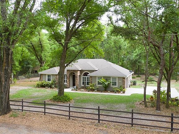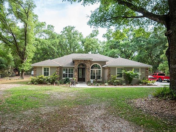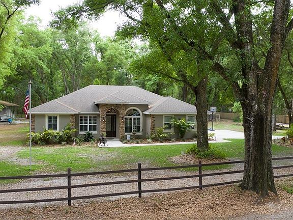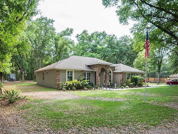 Welcome home to this tranquil retreat! Nestled inside the quiet community of Magnolia Oaks on a dead-end street is this custom four-bedroom, three-bathroom pool home with acid-wash concrete floors throughout sitting on over an acre of land, featuring tons of upgrades. As you enter the home into the foyer you are greeted with by high ceilings, a formal dining room to your right, formal living room/office area to your left and an abundance of light radiating through the beautiful plantation shutters. Through to the large family room, open to the kitchen which boasts wood cabinets, granite countertops with stainless steel appliances, a breakfast bar, and dining nook, all overlooking the large screened in pool with patio. This split floor plan offers privacy and comfort. Just off of the kitchen is the master bedroom with an en-suite featuring his and her sinks, walk-in closet, a garden tub and glass door shower. The master bedroom features a private entry to the pool and patio making this room feel like your personal oasis. Back through the family room, you'll find the remaining three bedrooms, one of which boasts an en-suite bathroom that also has private entry to the pool. Just beyond the pool is a large parking pad, covered parking large enough for your RV AND boat, a custom-built chicken coop, raised garden beds, and a custom brick paved patio with a fire pit, perfect for entertaining. Built in 2015, this home is move in ready and perfect for peaceful living with plenty of space for all your needs. Schedule a private showing today!