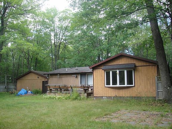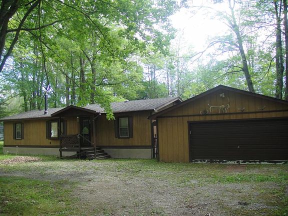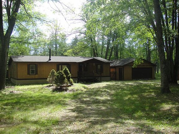 Three bedroom, 1400 sqft wood sided manufactured home sitting on 5+ acres located on a quiet street close to state land and three terrific golf courses! Split floor plan with a large living room and a 18' x 14' addition with a bay window on the back of the house. Woodstove, 2.5 garage, storage shed and back deck. Would make an excellent year round home or Up North weekend getaway. Some TLC is needed and reflected in the price. Being sold As Is.