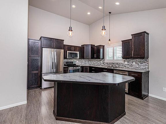 The fantastic high ceilings in the great room create an open, spacious feeling. The kitchen has a trendy backsplash and a fantastic island with abundant countertop space.