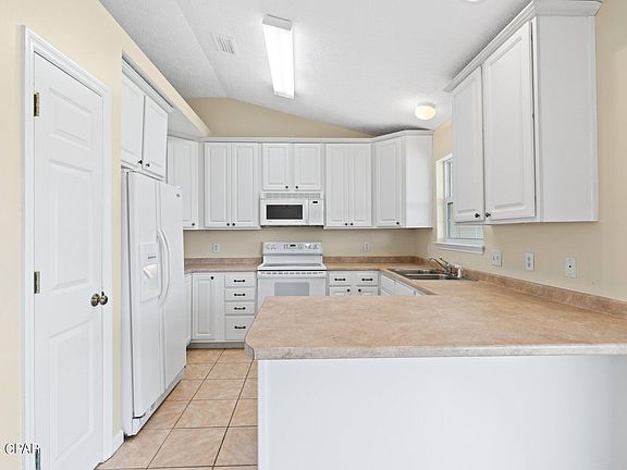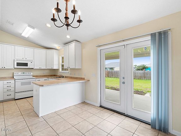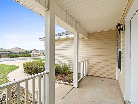 The living room area features vaulted ceiling with plant and decor shelving which adds a touch of personality. The kitchen, features a built-in microwave, dishwasher, refrigerator, and electric range. The convenient breakfast bar adds a touch of functionality, perfect for casual dining. The master bedroom is spacious and features trayed ceiling and a large walk-in closet for all your storage needs. Step outside to discover a large covered back porch, the perfect spot for hosting family gatherings and entertaining in the privacy of your backyard. The roof was replaced in 2019. A new air conditioning system installed in 2023 and a new water heater in 2024. Convenience is key in this family-friendly neighborhood, with schools located within the community and there is Not an HOA. Enjoy easy access to shopping, restaurants, entertainment, Tyndall AFB, and Panama City Beach. Schedule your tour today!