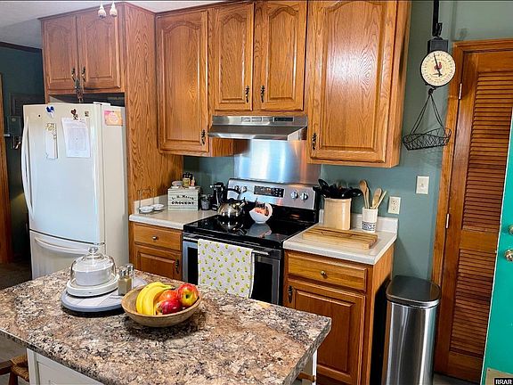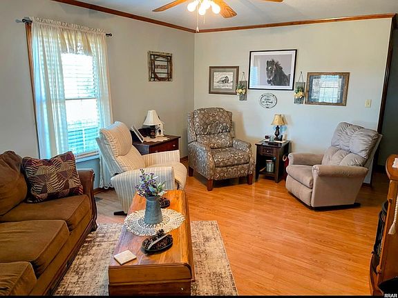 Charming 3BR, 2BA country home with a welcoming wrap around porch. Features a spacious living area, cozy kitchen with wood cabinetry, detached garage, beautifully kept yard and peaceful views.