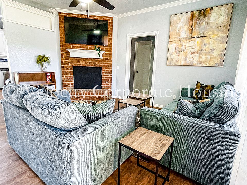 2 miles from the Tinker AFB MWC area. Close to shopping, great dining, and highway access. This property is tailored to insurance housing and traveling professionals. It is fully furnished with fast wifi, equipped kitchen, 4k TVs, and plush seating. This 3 bedroom 2 bath home has 4 beds, a huge primary suite, and a jetted tub. The kitchen has lots of storage, quartz countertops, a built-in microwave, and a smooth-top stove. The huge backyard has a covered patio and designated grilling space. Minimum lease term 1 month. Owner Pays all bills with a limit. No smoking inside the house or garage. House rules will be discussed